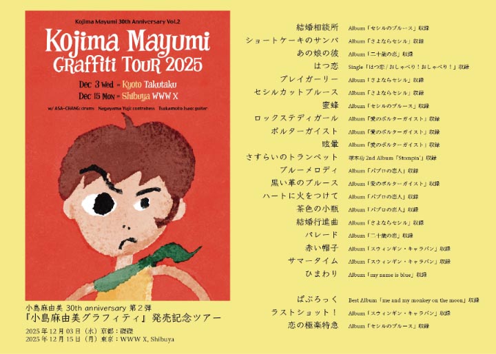 京都と東京の京・東ツアーとなりました、小島麻由美 30th anniversary 第2弾・『小島麻由美グラフィティ』発売記念ツアー、おかげさまで無事完走いたしました。皆様ご来場ありがとうございました!千穐楽となった12/15、WWW X 公演のセットリストを公開いたします。公演の思い出を振り返る一助となれば幸いです。